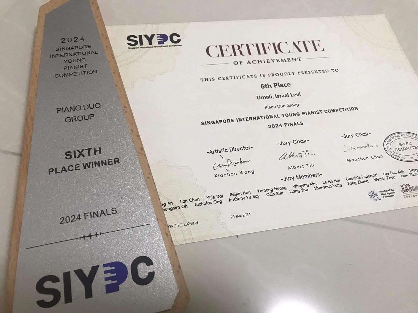 Israel was driven to become the best pianist he can be and soon began joining local competitions. His recent wins include placing sixth under the Piano Duo Category by the Singapore International Young Pianist Competition in January 2024 and placing 3rd under the B2 Etudes Category by the Piano Teachers Guild of the Philippines Foundation, Inc., in April 2024.